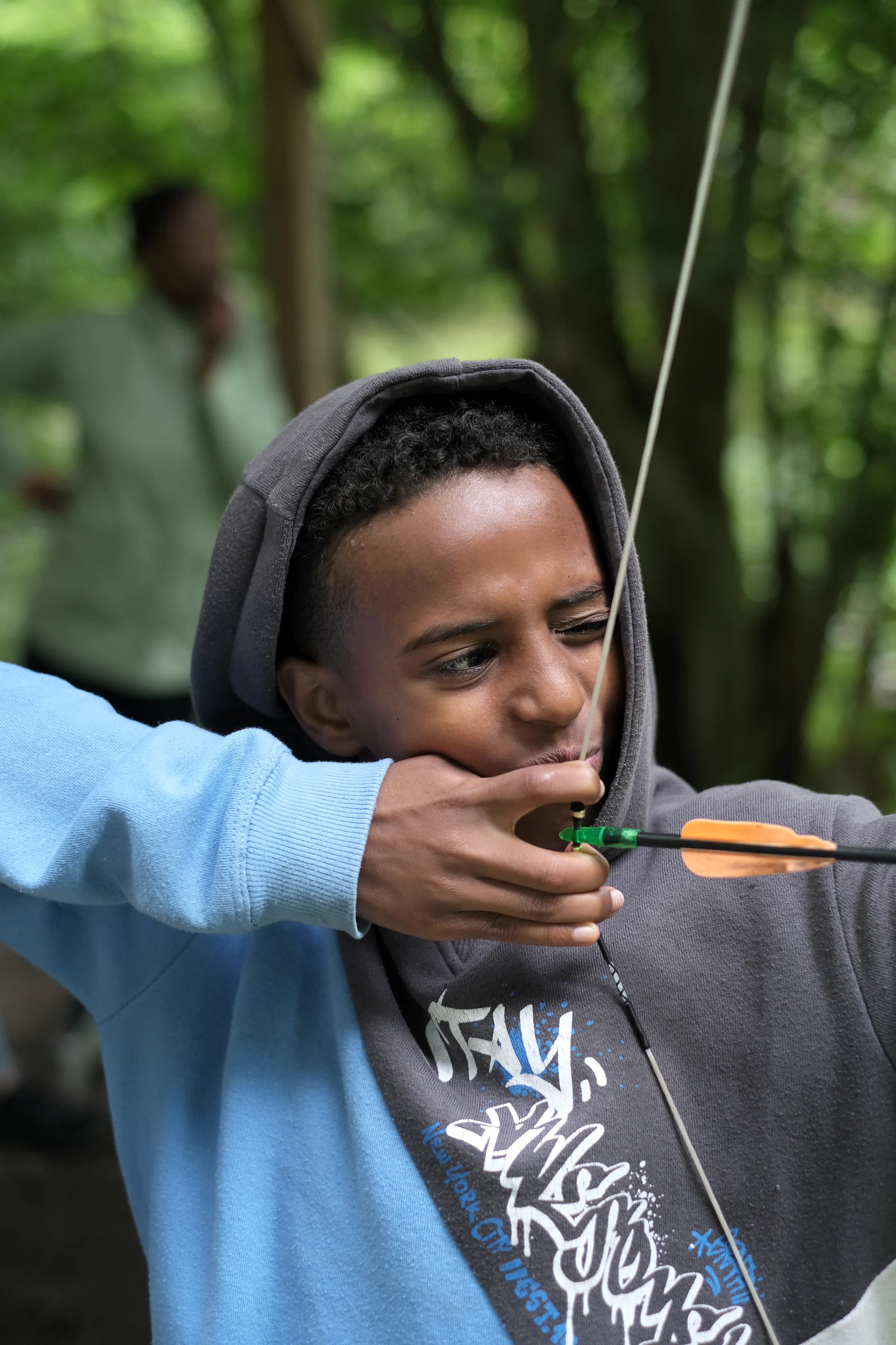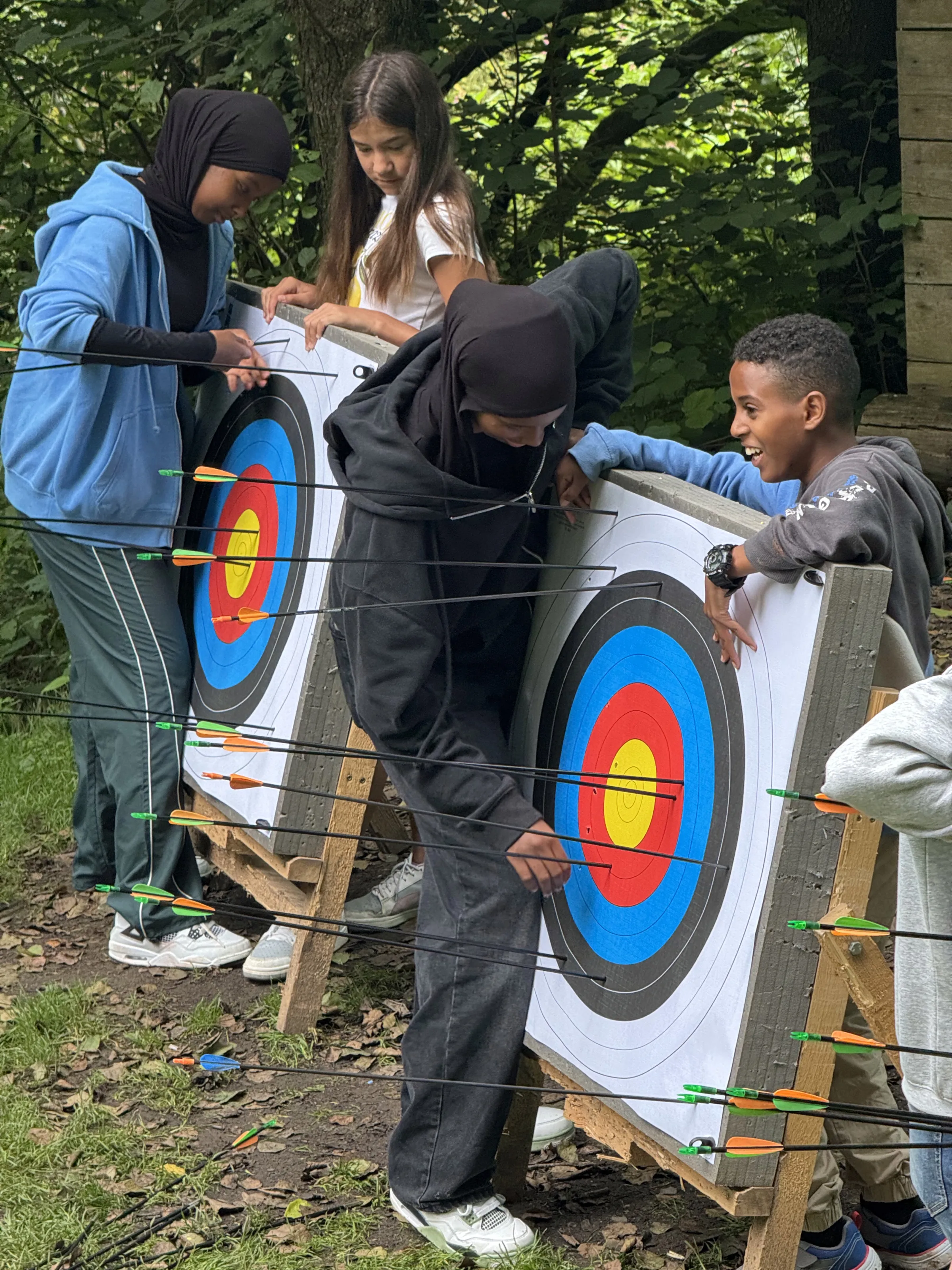 Beim Bogenschießen hatten wir einen ganzen Vormittag Zeit, um uns auszuprobieren und besser zu werden. Paul vom SportCamp zeigte uns zuerst, welches Auge stärker ist und wie wir den Bogen richtig halten. Dann ging es direkt los – und wir hatten tatsächlich ein paar Naturtalente dabei, die gleich mehrfach ins Gelbe trafen.