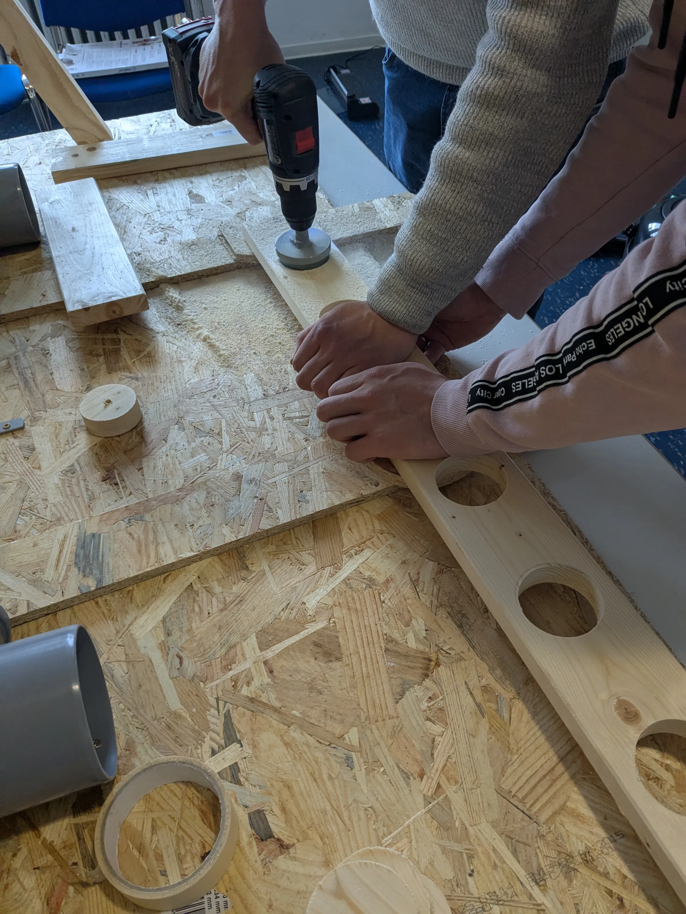 Beim Besuch im Atelier von Arya Atti konnte die Gruppe Kunst zum Anfassen erleben. Und es war schnell klar: Wir wollen die sogenannte "Handinstallation" in die Ausstellung bringen. Also traf man sich mit den Fleißigen und sägte, baute, tapezierte, hämmerte, klebte… und fertig war alles zum Abtransport nach Lohfelden in das Rathaus.
